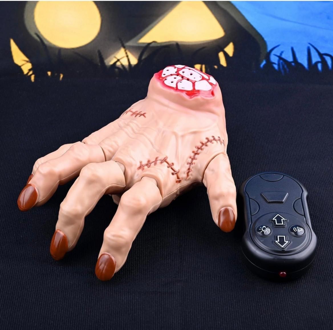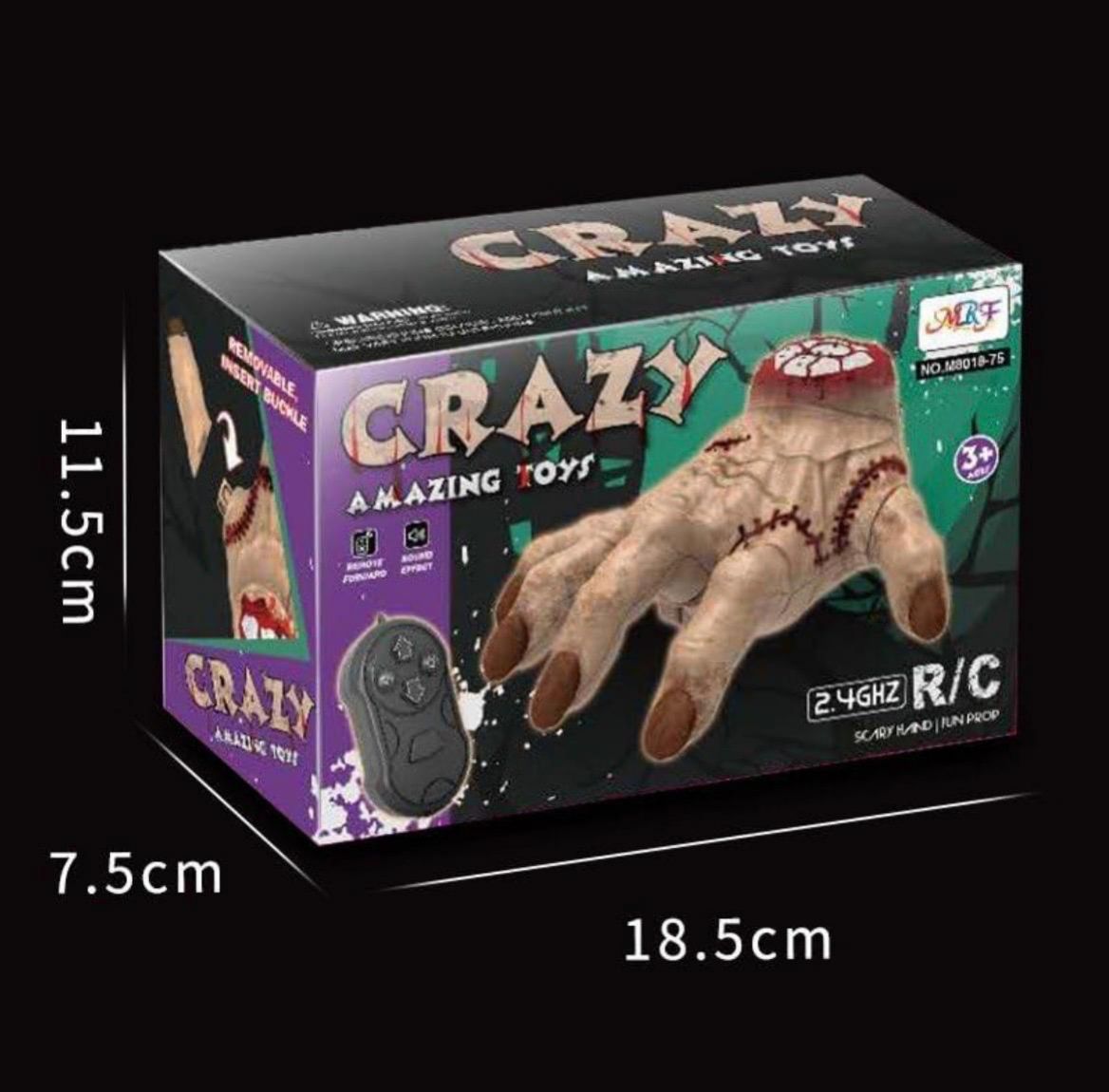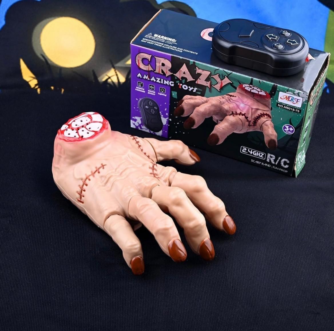 Remote control crawling zombie hand toy with creepy movement and sound effects. Powered by 2.4GHz RC for smooth control and equipped with a rechargeable battery. Fun and spooky toy for kids, ideal for pranks, Halloween play, and indoor entertainment. Suitable for ages 3+.