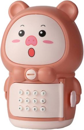 Adorable bear-shaped electronic piggy bank with password protection. Kids can insert coins or fold and deposit paper money easily. Features keypad lock system and safe money storage, making saving fun and exciting for children.