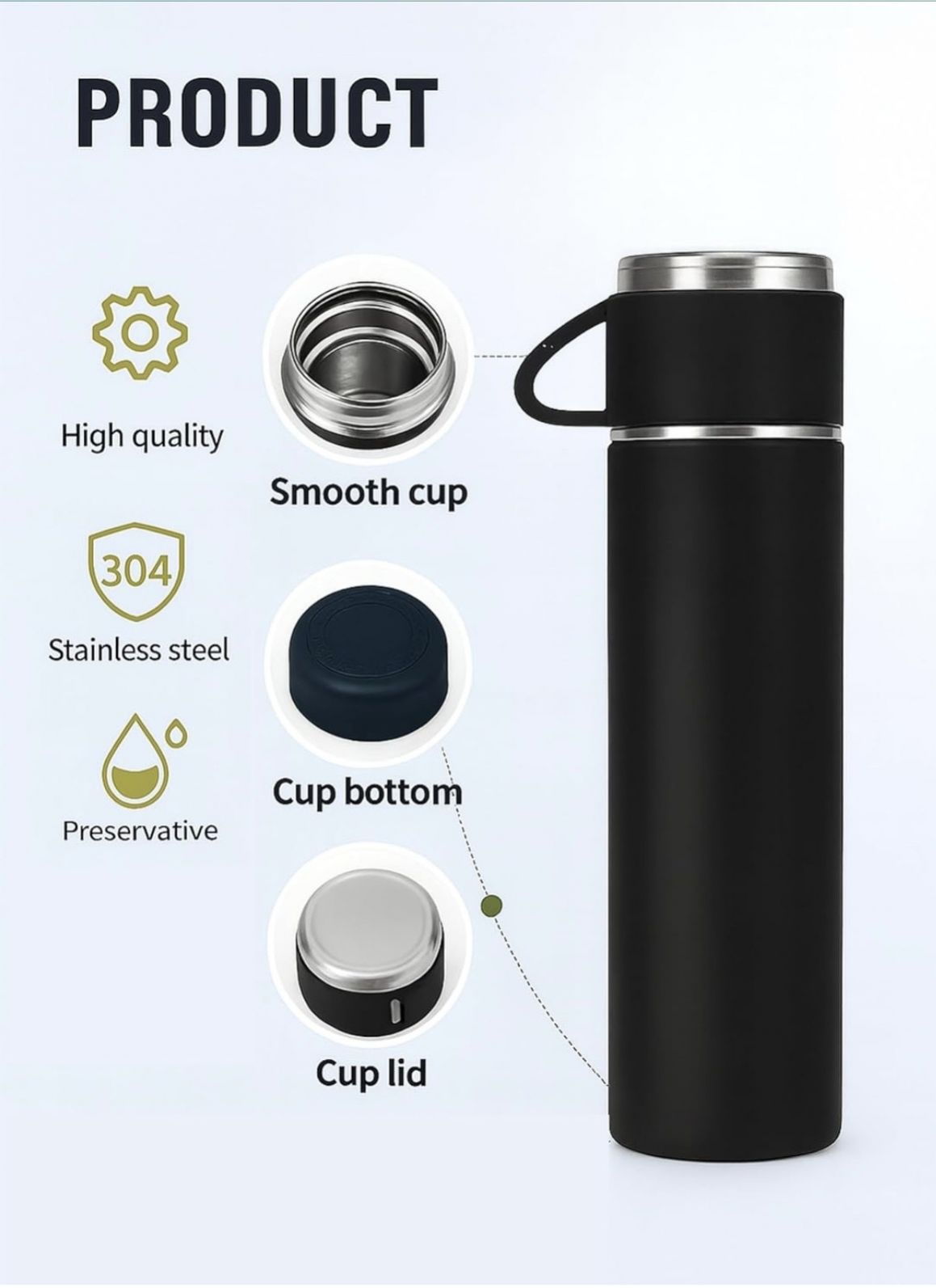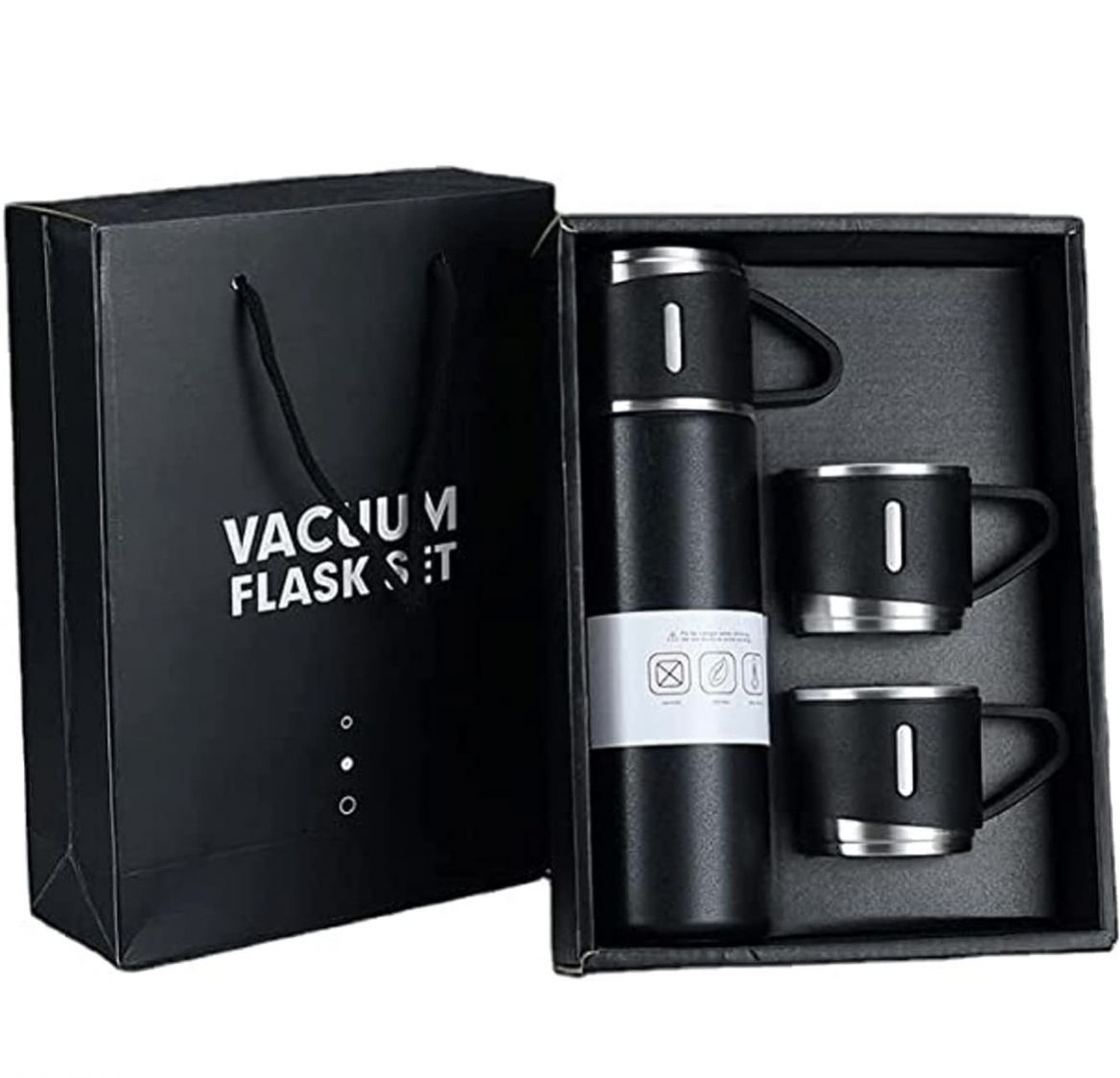 Premium vacuum flask set featuring a stainless steel insulated bottle with matching cups. Keeps beverages hot or cold for hours, packed in an elegant gift box—perfect for travel, office, or gifting.