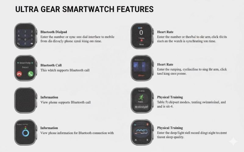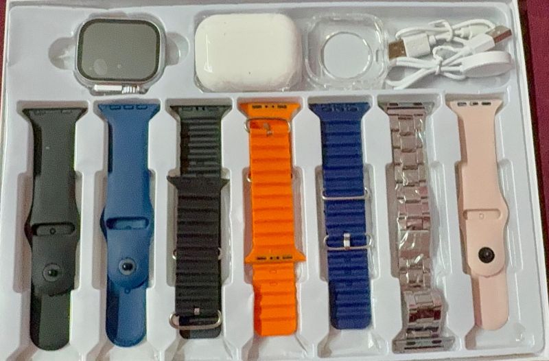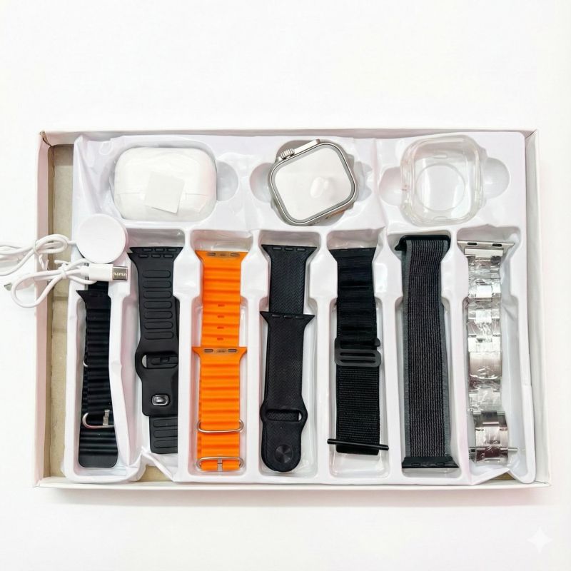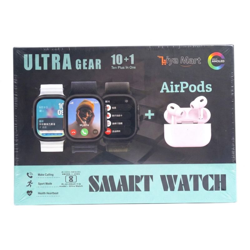 ULTRA GEAR 10+1 Smart Watch Combo with AMOLED Display and Wireless AirPods. Features Bluetooth calling, health monitoring, sport modes, and premium design—perfect all-in-one gadget combo for daily use.